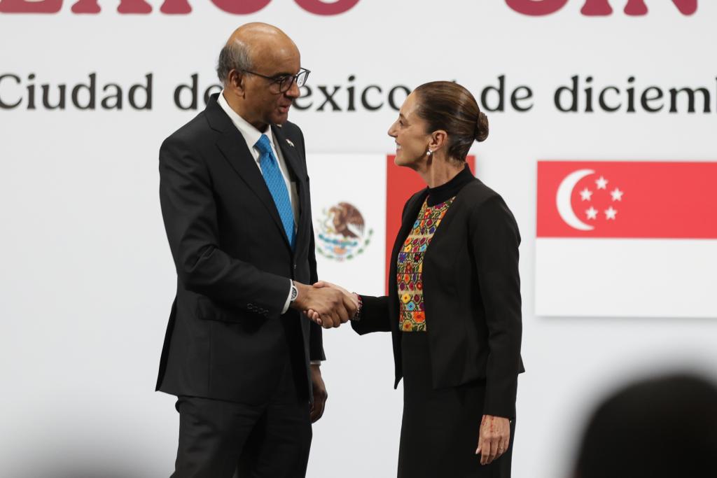 CIUDAD DE MEXICO, 1 diciembre, 2025 (Xinhua) — La presidenta mexicana, Claudia Sheinbaum (d), y el presidente de Singapur, Tharman Shanmugaratnam (i), asisten a una conferencia de prensa conjunta, en Palacio Nacional, en la Ciudad de México, capital de México, el 1 de diciembre de 2025. (Xinhua/Francisco Cañedo)