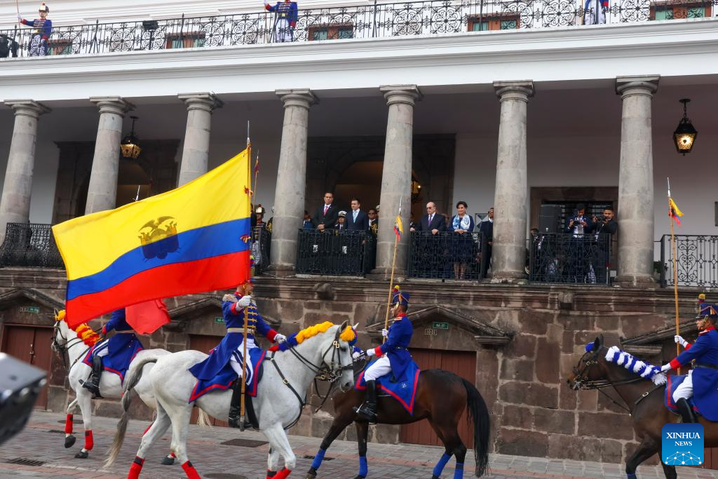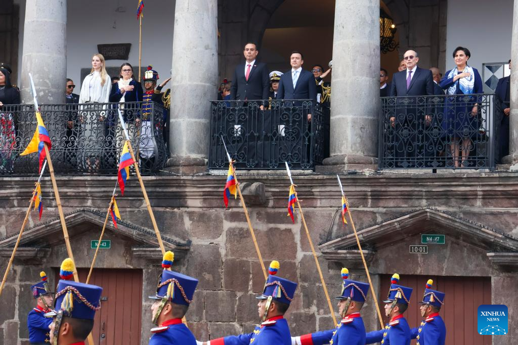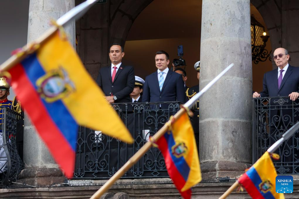 QUITO, 12 diciembre, 2025 (Xinhua) — El presidente ecuatoriano, Daniel Noboa (c-d), y el presidente peruano, José Jerí (c-i), reaccionan en el marco del Encuentro Presidencial e instalación del XVI Gabinete Binacional Ecuador-Perú, en el Palacio de Carondelet, en la ciudad de Quito, capital de Ecuador, el 12 de diciembre de 2025. Noboa y Jerí firmaron el viernes en Quito una declaración conjunta que incluye 57 compromisos políticos y de cooperación en diversos ámbitos, con énfasis en la seguridad y el fortalecimiento del control de las fronteras. (Xinhua/Ricardo Landeta)