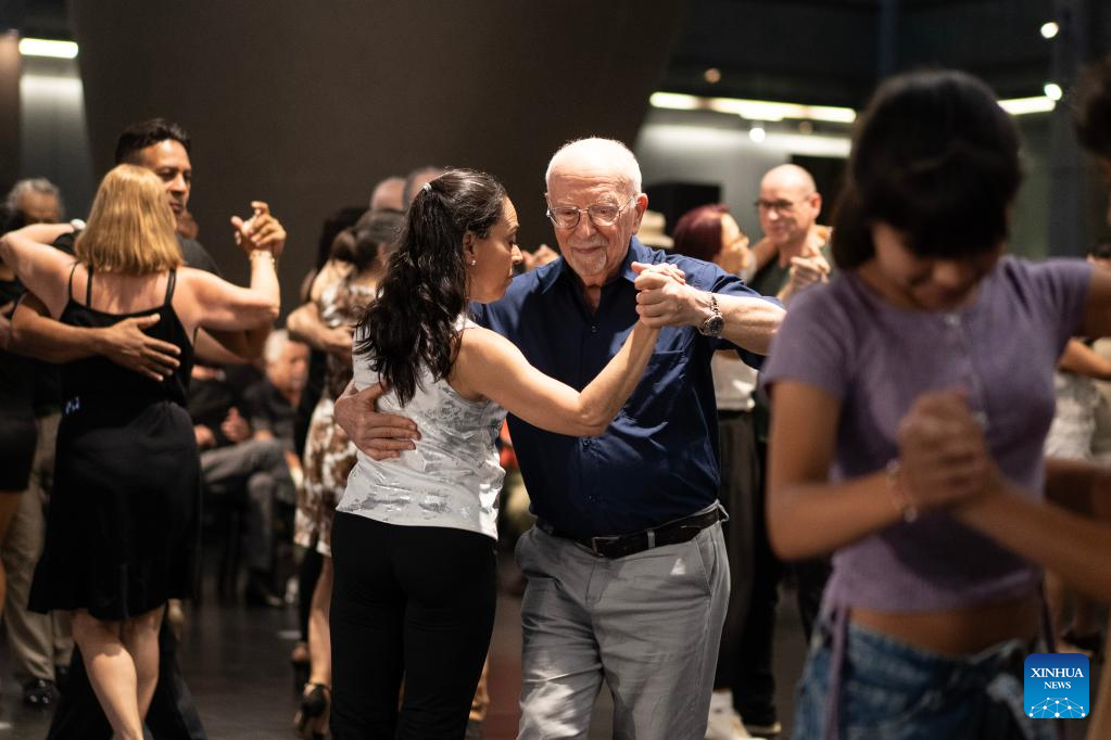 BUENOS AIRES, 12 diciembre, 2025 (Xinhua) — Imagen del 11 de diciembre de 2025 de parejas bailando tango durante una clase en el marco del Día Nacional del Tango en el Centro Cultural Palacio Libertad, en la ciudad de Buenos Aires, capital de Argentina. Argentina celebró el jueves el Día Nacional del Tango, una fecha establecida para recordar los nacimientos de Carlos Gardel y Julio de Caro, dos de los máximos exponentes de la cultura popular y referentes fundamentales de la música y la danza del país sudamericano. (Xinhua/Martín Zabala)