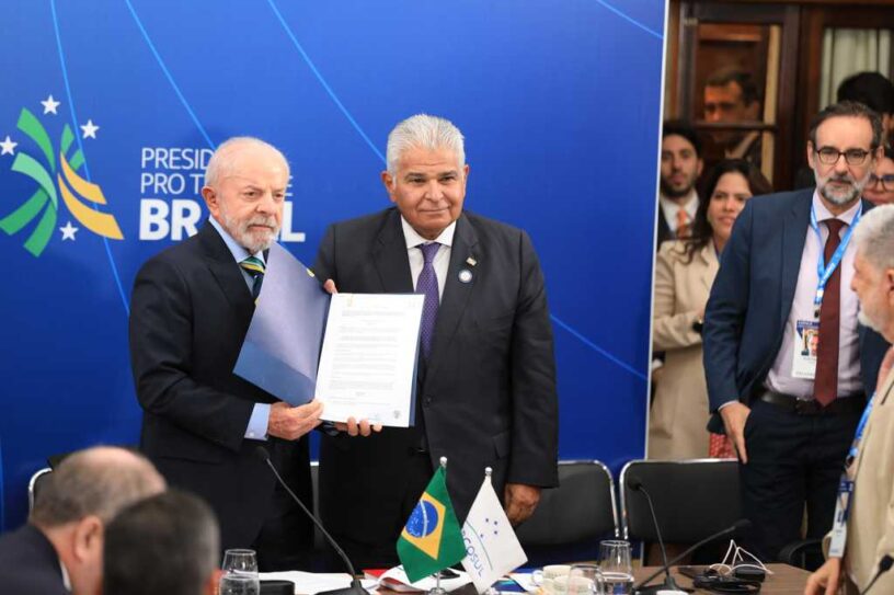 Foz de Iguazú, Brasil, 20 dic (Prensa Latina) El presidente de Panamá, José Raúl Mulino, entregó hoy a su par brasileño Luiz Inacio Lula Da Silva el documento para la adhesión a Mercosur como Estado Asociado.