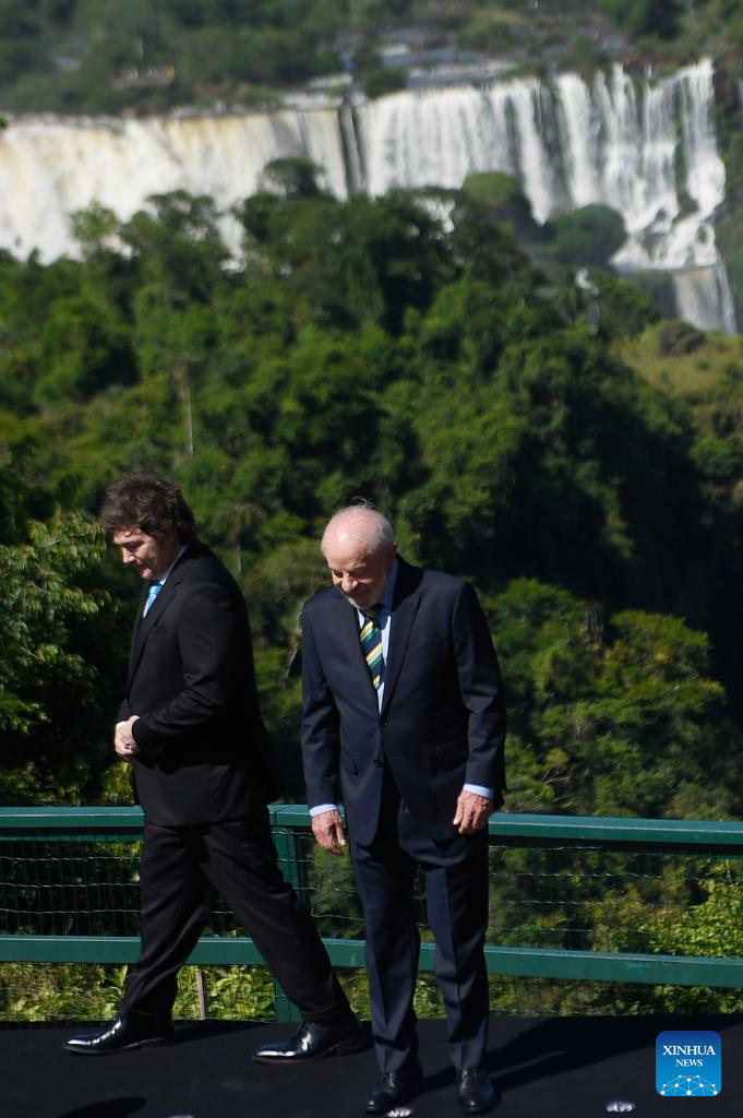 FOZ DO IGUACU, 20 diciembre, 2025 (Xinhua) — El presidente brasileño, Luiz Inácio Lula da Silva (d), y el presidente argentino, Javier Milei (i), llegan para participar en la toma de una fotografía familiar durante la 67ª Cumbre de Jefes de Estado del Mercado Común del Sur (Mercosur), en Foz do Iguacu, Brasil, el 20 de diciembre de 2025. Lula da Silva abrió el sábado en la ciudad de Foz do Iguacu, estado de Paraná, la 67ª Cumbre de Jefes de Estado del Mercosur, afirmando que el bloque es un ejemplo de multilateralismo y que «el mundo está ávido por cerrar acuerdos» con él. (Xinhua/Lucio Tavora)