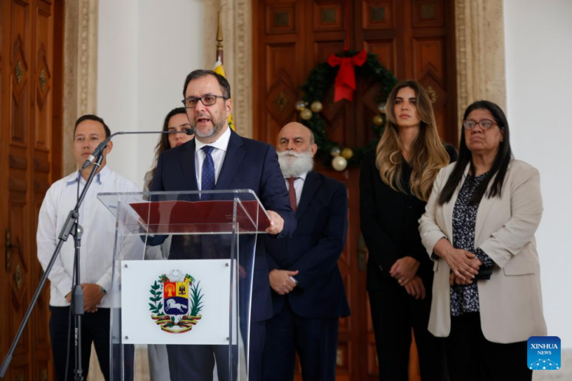 El canciller venezolano, Yván Gil, habla durante una conferencia de prensa, en Caracas, Venezuela, el 22 de diciembre de 2025. El presidente venezolano, Nicolás Maduro, envió una carta a los jefes de estados latinoamericanos y a los miembros de la Organización de las Naciones Unidas, para alertar sobre las agresiones de Estados Unidos sobre Venezuela y que impactan en la región, informó el lunes el canciller de la nación sudamericana, Yván Gil. (Xinhua/Str)