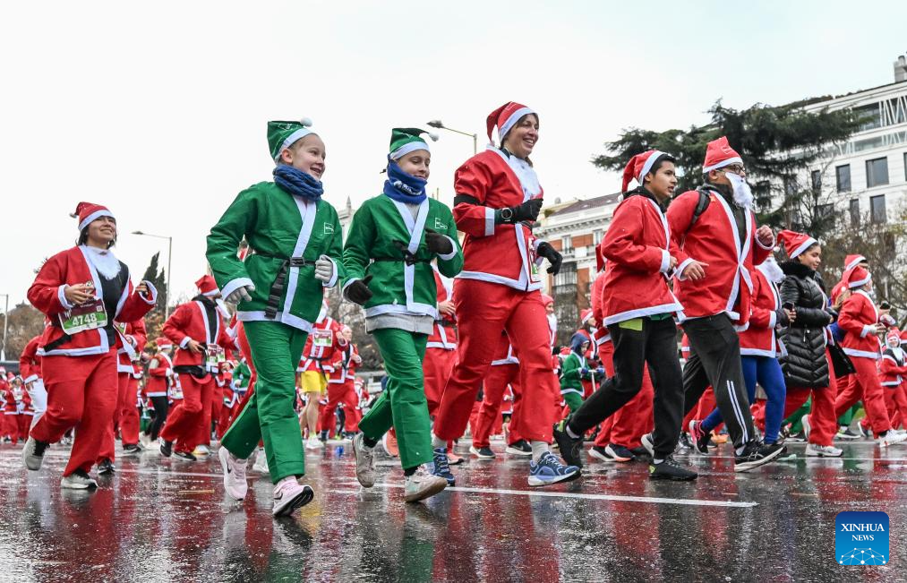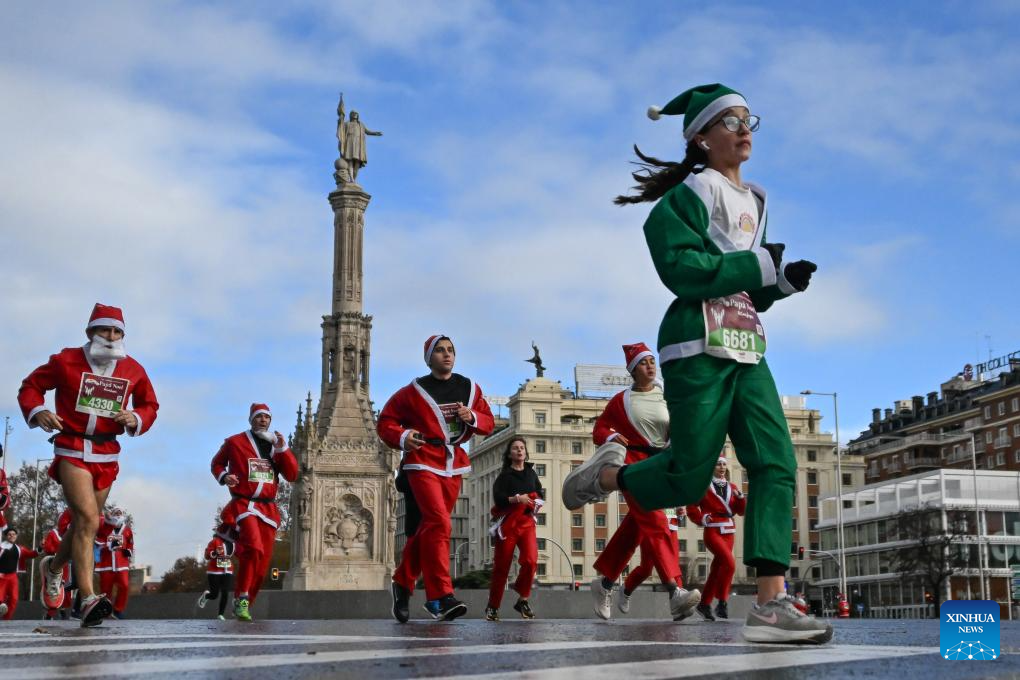 MADRID, 22 diciembre, 2025 (Xinhua) — Imagen del 21 de diciembre de 2025 de corredores disfrazados como Santa Claus asistiendo a un evento de carreras con temática navideña, en Madrid, España. (Xinhua/Cheng Min)