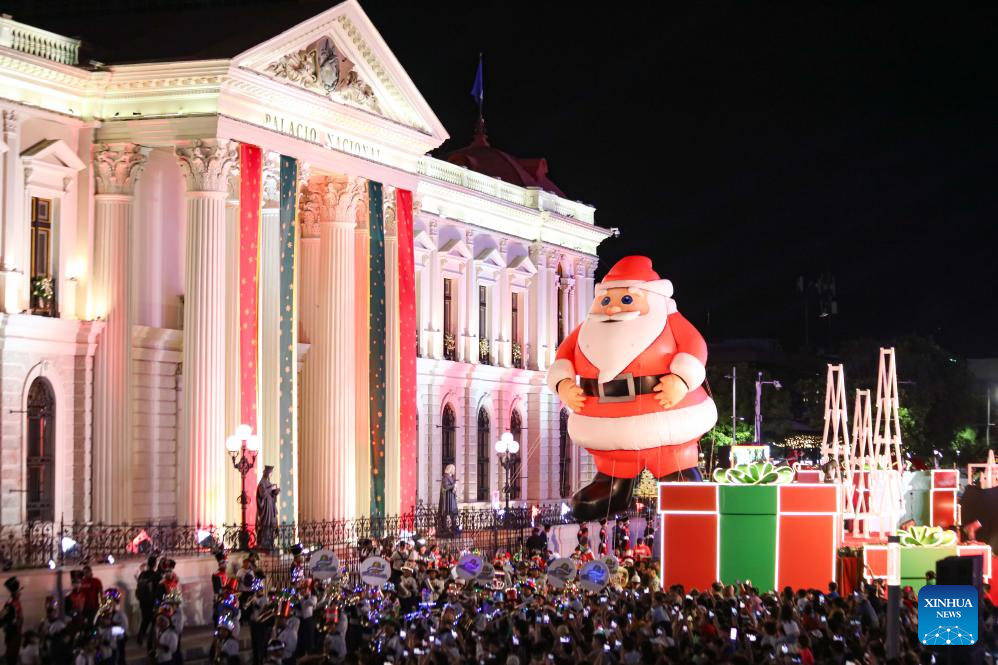 SAN SALVADOR, 22 diciembre, 2025 (Xinhua) — Imagen del 21 de diciembre de 2025 de personas observando un globo gigante con la figura de Santa Claus frente al Palacio Nacional durante la segunda edición del Desfile de Globos Gigantes en el Centro Histórico, en el departamento de San Salvador, capital de El Salvador. (Xinhua/Alexander Peña)