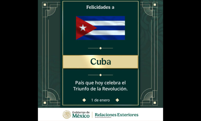 “La @SRE_mx extiende una calurosa felicitación al pueblo y Gobierno de Cuba, por la celebración del Triunfo de la Revolución”, expresó la Secretaría de Relaciones Exteriores en un mensaje a través de su cuenta en la red social X.