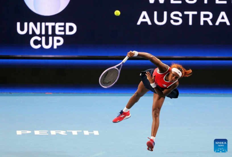 PERTH, 4 enero, 2026 (Xinhua) — Imagen del 3 de enero de 2026 de Coco Gauff, de Estados Unidos, sirviendo la pelota durante el encuentro de individuales femeninos ante Solana Sierra, de Argentina, del partido de round robin (todos contra todos) del Grupo A entre Estados Unidos y Argentina, en el torneo de tenis United Cup 2026, en Perth, Australia. (Xinhua/Zhou Dan)