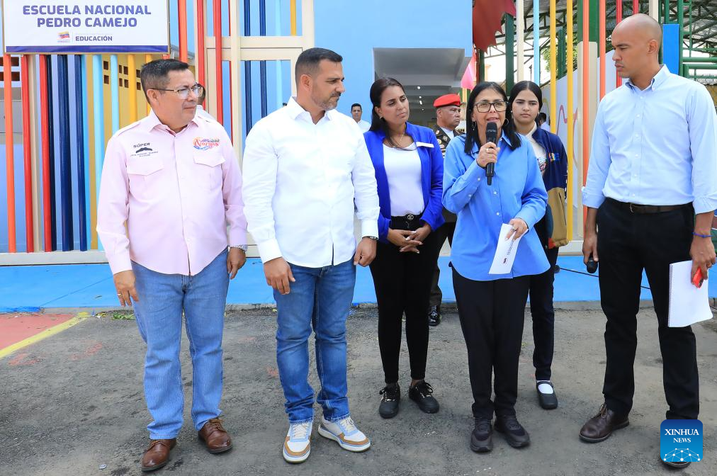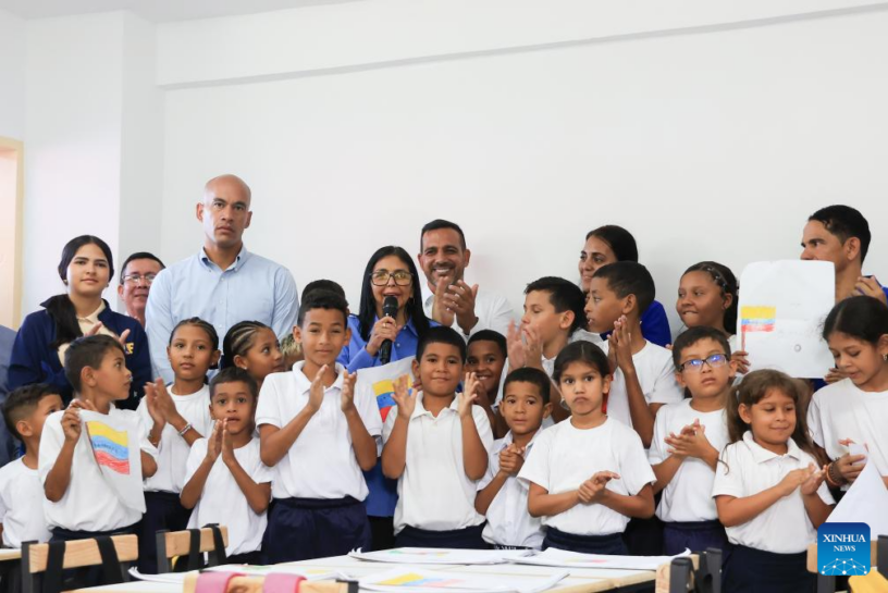 Imagen proveída por la Presidencia de Venezuela, de la presidenta encargada de Venezuela, Delcy Rodríguez (2-d-frente), hablando durante la inauguración del curso escolar, en Catia la Mar, estado La Guaira, Venezuela, el 12 de enero de 2026. Rodríguez aseguró el lunes que en el país sudamericano «hay un gobierno que manda» y que avanza en las relaciones internacionales con respeto. (Xinhua/Presidencia de Venezuela)