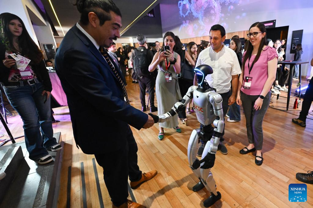 Un hombre interactúa con un robot durante la decimoquinta edición del Congreso Futuro de Chile, en el Centro Cultural CEINA, en Santiago, capital de Chile, el 12 de enero de 2026. Autoridades y expertos llaman a pensar en tiempos complejos «hacia dónde vamos como humanidad», en el marco del arranque de la decimoquinta edición del Congreso Futuro de Chile, el espacio de encuentro de las ideas y el pensamiento de América Latina. (Xinhua/Jorge Villegas)