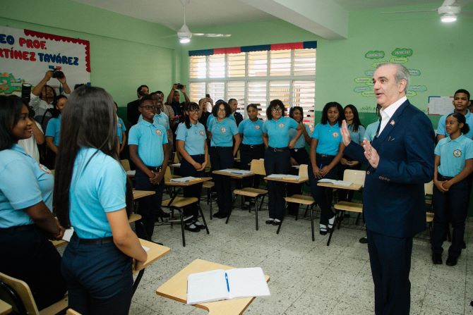 Santo Domingo, R. D., 13 de enero, 2025.– El presidente de la República, Luis Abinader, fungió este martes como docente al impartir una clase de Moral, Cívica y Ética Ciudadana a estudiantes de 5.° grado del Liceo Germán Martínez, donde expresó que esta materia debe colocarse delante en el sistema educativo porque permite formar mejores compañeros, mejores parejas, mejores ciudadanos y mejores dominicanos del mundo.