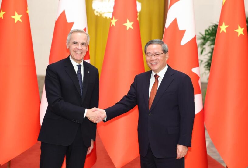 BEIJING, 15 enero, 2026 (Xinhua) — El primer ministro chino, Li Qiang, sostiene conversaciones con el primer ministro canadiense, Mark Carney, quien se encuentra en visita oficial a China, en el Gran Palacio del Pueblo, en Beijing, capital de China, el 15 de enero de 2026. (Xinhua/Huang Jingwen)