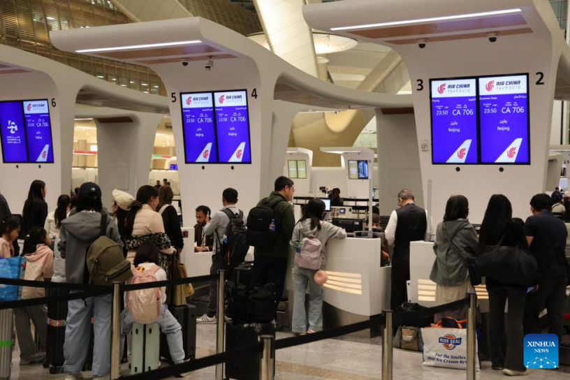 ABU DABI, 25 enero, 2026 (Xinhua) — Imagen del 24 de enero de 2026 de pasajeros preparándose para abordar un vuelo hacia Beijing en el Aeropuerto Internacional de Zayed, en Abu Dabi, Emiratos Arabes Unidos (EAU). Una ruta aérea directa entre la capital de China, Beijing y Abu Dabi, en los EAU, ha sido lanzada, marcando la primera conexión directa entre ambas capitales operada por una aerolínea china. (Xinhua)
