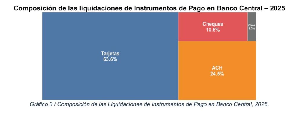Desde una perspectiva de composición, la distribución de las liquidaciones de los instrumentos de pago de bajo valor en el año 2025 muestra una marcada concentración en operaciones con tarjetas de pago, las que representaron el 63.6 % del valor total liquidado, evidenciando su rol predominante dentro de este segmento. En términos de participación continúa el sistema de débitos y créditos directos (ACH), con 24.5 %, mientras que los cheques concentraron el 10.6 % del total. El restante 1.3 % correspondió a los sistemas de pagos móviles y subagentes bancarios.
