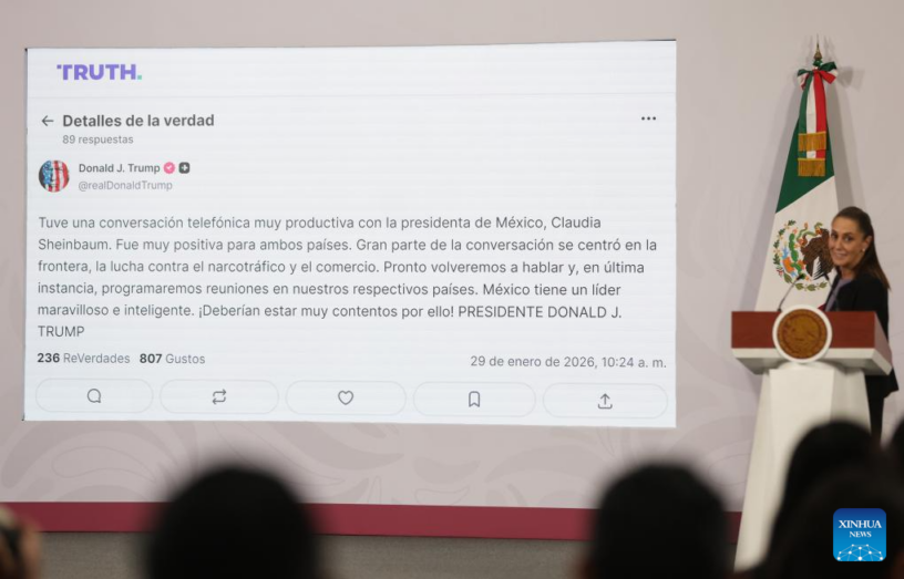 MÉXICO, 29 ene (Xinhua) — La presidenta de México, Claudia Sheinbaum, dio a conocer hoy jueves que mantuvo una llamada telefónica con su par de Estados Unidos, Donald Trump, en la que abordaron temas comerciales y relevantes de la relación entre ambas naciones.