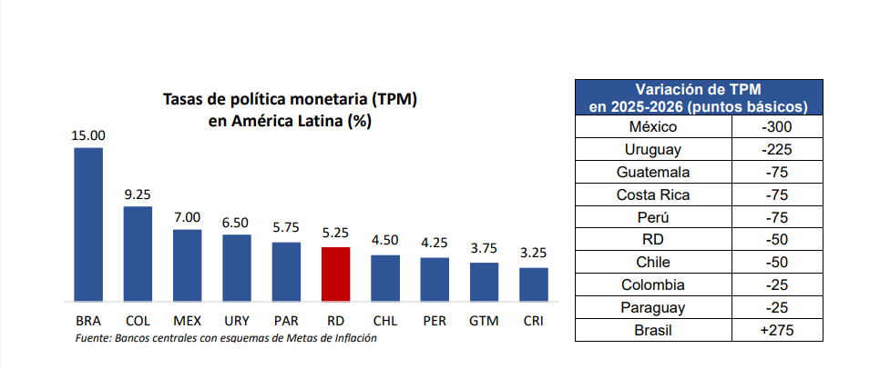 El Banco Central de la República Dominicana (BCRD), en su reunión de política monetaria de enero de 2026, decidió mantener sin cambios su tasa de interés de política monetaria (TPM), en 5.25 % anual. Asimismo, la tasa de la facilidad permanente de expansión de liquidez (Repos a 1 día) permanece en 5.75 % anual, mientras la tasa de depósitos remunerados (Overnight) continúa en 4.50 % anual.