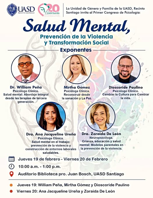 Santiago de los Caballeros, 4 de febrero, 2026.- La Unidad de Género y Familia de la UASD Recinto Santiago invita al Primer Congreso de Psicología “Salud Mental”, un espacio concebido para el aprendizaje, la reflexión y el diálogo en torno al bienestar emocional y la importancia de fortalecer la salud mental en la comunidad universitaria y en la sociedad