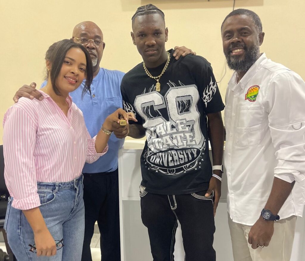 Daylin Thomas, del equipo de Consuelo, recibe su anillo de campeón del TBS SPM 2025, de Carla y Carlos Robles, junto a Fidel Catillo.