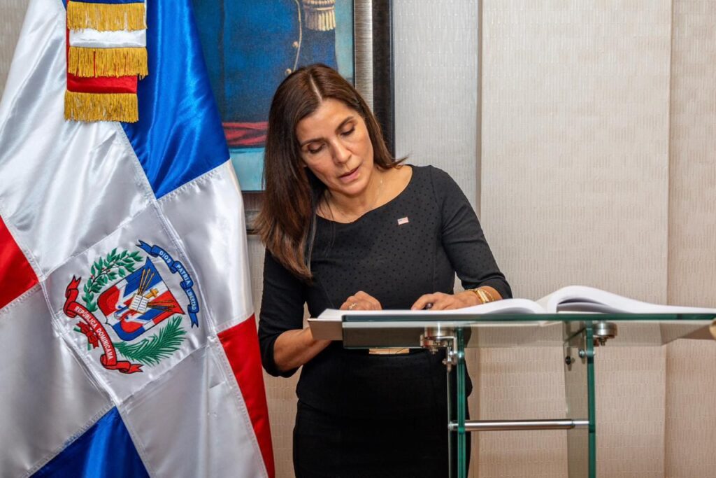 La Embajadora de los Estados Unidos de América en República Dominicana procede a firmar el libro de recibimiento.