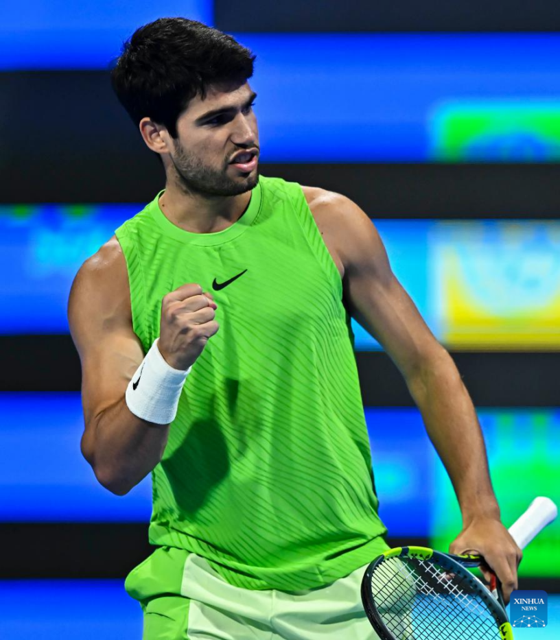 DOHA, 22 febrero, 2026 (Xinhua) — Imagen del 21 de febrero de 2026 de Carlos Alcaraz festejando después de ganar el partido final de individuales masculinos entre Carlos Alcaraz, de España, y Arthur Fils, de Francia, en el torneo de tenis Abierto de Qatar de la ATP 2026, en Doha, Qatar. (Xinhua/Nikku)