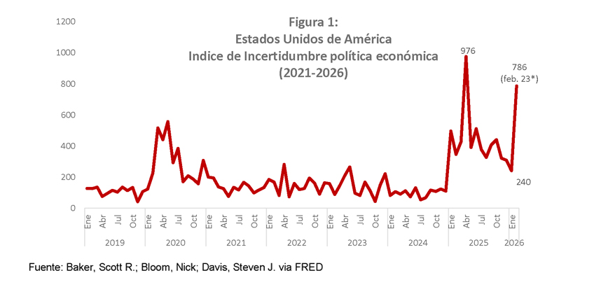Según el Fondo Monetario Internacional (FMI), la economía mundial crecería alrededor de 3.3 % en 2026, impulsada principalmente por una mayor expansión de las economías avanzadas. Sin embargo, este escenario enfrenta significativos riesgos a la baja ante el recrudecimiento de la incertidumbre mundial. En efecto, el índice de incertidumbre de política económica de EE. UU., que había mostrado una moderación en la segunda parte de 2025, ha repuntado nuevamente (Figura 1).