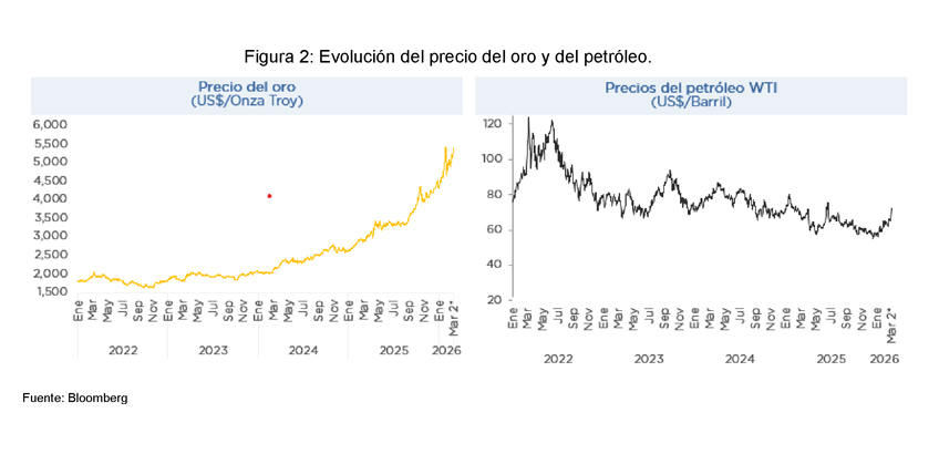 Desde comienzos de 2026, los riesgos geopolíticos han aumentado significativamente. La escalada del conflicto entre Estados Unidos, Israel e Irán ha llevado a ataques directos en Teherán y a represalias iraníes contra Israel y bases estadounidenses en distintos países entre los que se incluyen los Emiratos Árabes Unidos, Catar, Bahréin, Arabia Saudita y Kuwait, entre otros. Esta situación, sumada a la inestabilidad en Venezuela y a tensiones en regiones no tradicionales como Groenlandia, ha afectado los mercados energéticos, el comercio marítimo y la percepción de riesgo global, reduciendo las expectativas de crecimiento mundial.