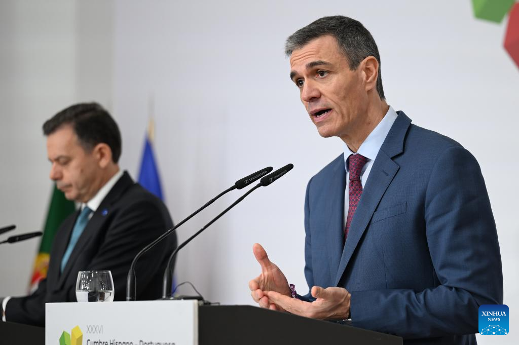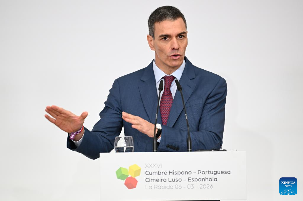 HUELVA, 6 marzo, 2026 (Xinhua) — Imagen proveída por La Moncloa del presidente del Gobierno español, Pedro Sánchez (d), hablando durante una conferencia de prensa después de la Cumbre Hispano-Portuguesa, en La Rábida, en Huelva, España, el 6 de marzo de 2026. Sánchez afirmó el viernes que la acción militar de Estados Unidos e Israel contra Irán constituye un «error extraordinario» y rechazó las críticas del presidente estadounidense, Donald Trump, por la negativa de España a permitir que Estados Unidos utilice sus bases en el país en el actual asalto aéreo. (Xinhua/La Moncloa)