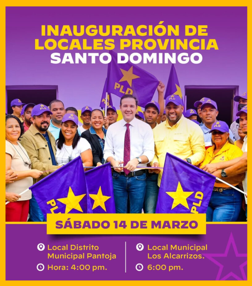 El Partido de la Liberación Dominicana (PLD), programó para este sábado sendos actos inaugurales de locales de esa organización en el municipio Los Alcarrizos y en el distrito municipal, Pantoja, ambos de la provincia Santo Domingo.