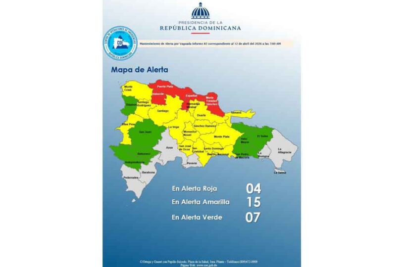Cuatro provincias permanecen en alerta roja (máxima): Puerto Plata, Espaillat, Hermanas Mirabal y María Trinidad Sánchez, por alto riesgo de inundaciones y deslizamientos.