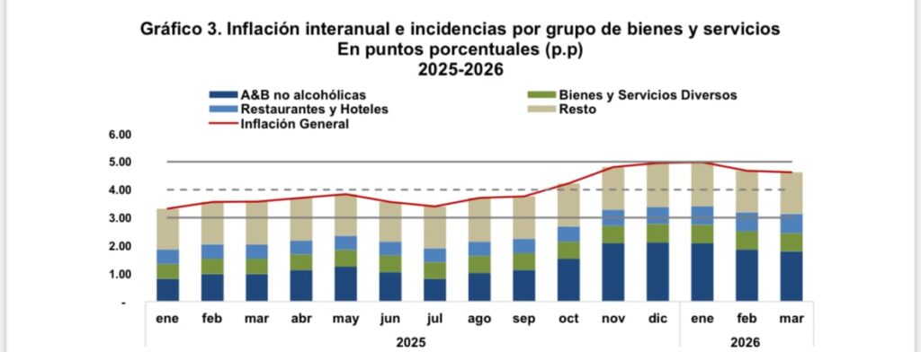 Recientemente, el aumento en los precios de los referidos rubros alimenticios se ha revertido parcialmente, moderando el ritmo de expansión interanual del grupo Alimentos y Bebidas No Alcohólicas y del IPC general. Esta disminución en la inflación interanual de los alimentos, junto a la apreciación acumulada de 3.4 % experimentada por el peso dominicano en los primeros tres meses del presente año, ha permitido que la inflación general haya permanecido dentro del rango meta de 4 % ± 1 % hasta el cierre del mes de marzo de 2026, a pesar de las renovadas presiones inflacionarias de origen externo que han impactado al mundo fruto de la guerra entre Estados Unidos e Irán iniciada a finales de febrero, dado el aumento significativo en el precio del petróleo y sus derivados en los mercados internacionales.