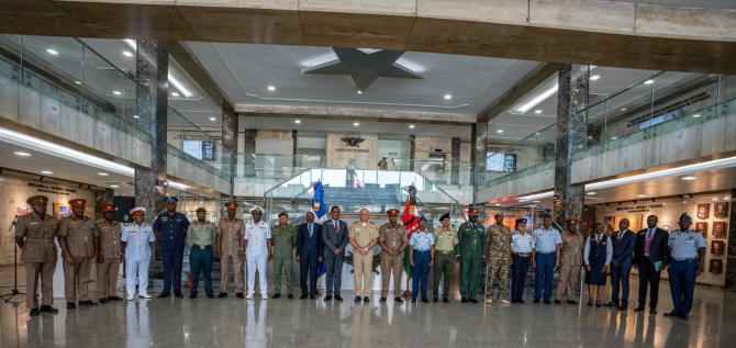 Santo Domingo, R. D., 15 de abril, 2026.- El Ministerio de Defensa recibió a una delegación de cursantes del Curso sobre Seguridad Nacional y Estrategia del Colegio de Defensa Nacional de Kenia, como parte de una visita académica orientada al intercambio de experiencias y al fortalecimiento de la cooperación internacional en materia de seguridad y defensa.