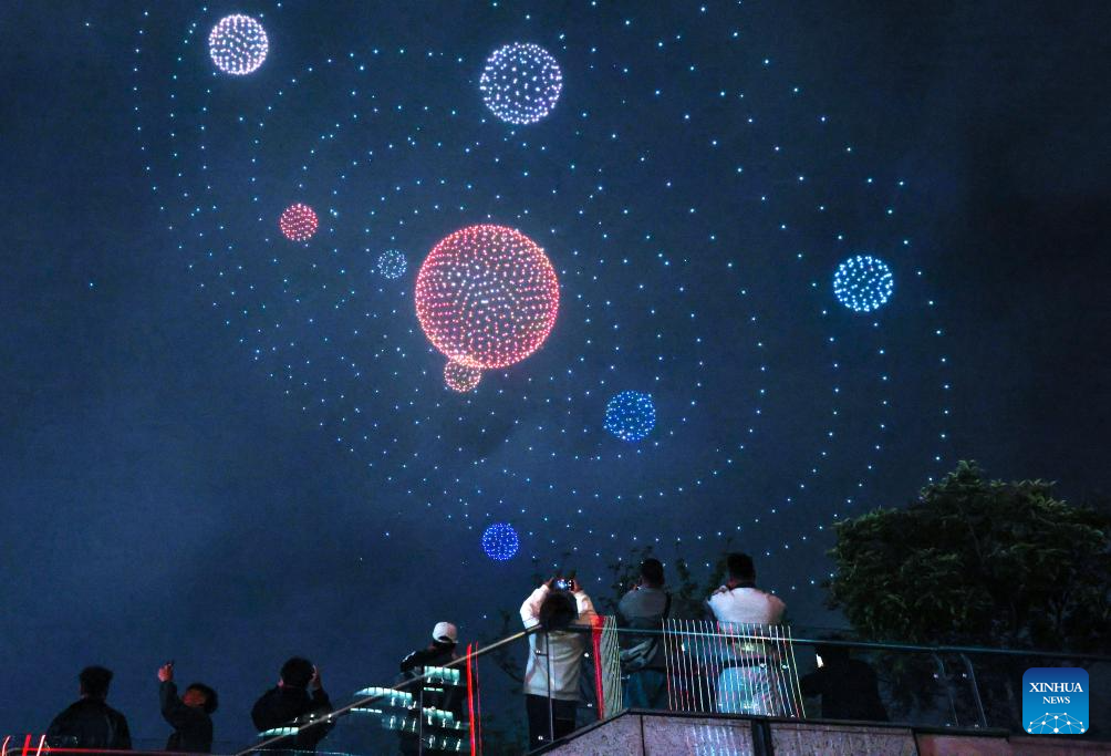 GUIYANG, 15 abril, 2026 (Xinhua) — Imagen del 14 de abril de 2026 de personas observando un espectáculo de luces con drones, en el distrito de Guanshanhu, en Guiyang, en la provincia de Guizhou, en el suroeste de China. Un espectáculo de luces con drones fue presentado el martes en Guiyang, mostrando el auge de la industria de macrodatos de la ciudad y sus ricos recursos culturales y turísticos. (Xinhua/Yang Wenbin)