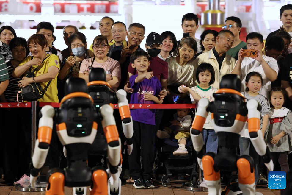 FUZHOU, 19 abril, 2026 (Xinhua) — Personas observan una presentación de baile de robots, en Fuzhou, en la provincia de Fujian, en el sureste de China, el 19 de abril de 2026. Una presentación de baile de robots fue realizada aquí para dar la bienvenida a la IX Cumbre Digital de China, que se celebrará en Fuzhou del 29 al 30 de abril. (Xinhua/Jiang Kehong)
