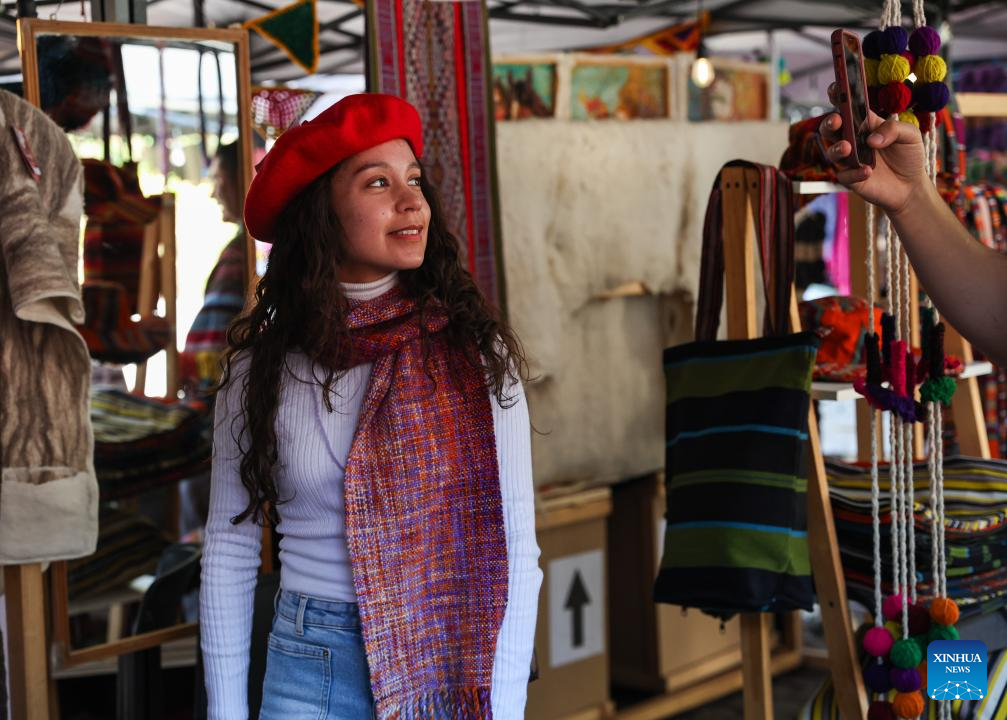 SANTIAGO, 26 abril, 2026 (Xinhua) — Imagen del 25 de abril de 2026 de una mujer probándose un gorro de lana en un festival de lana, en Santiago, Chile. (Xinhua/Zhou Jiayi)