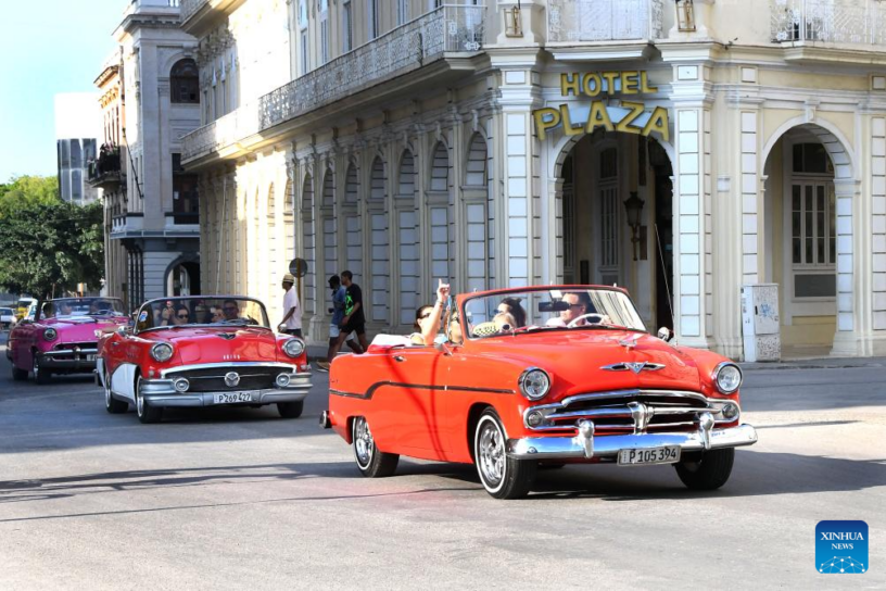 Imagen del 27 de abril de 2026 de turistas circulando a bordo de automóviles antiguos frente al Hotel Plaza, en La Habana, capital de Cuba. Cuba registró una caída del 48 por ciento en la llegada de turistas internacionales en el primer trimestre del año, de acuerdo con un reporte divulgado el martes por la Oficina Nacional de Estadísticas e Información. (Xinhua/Joaquín Hernández)