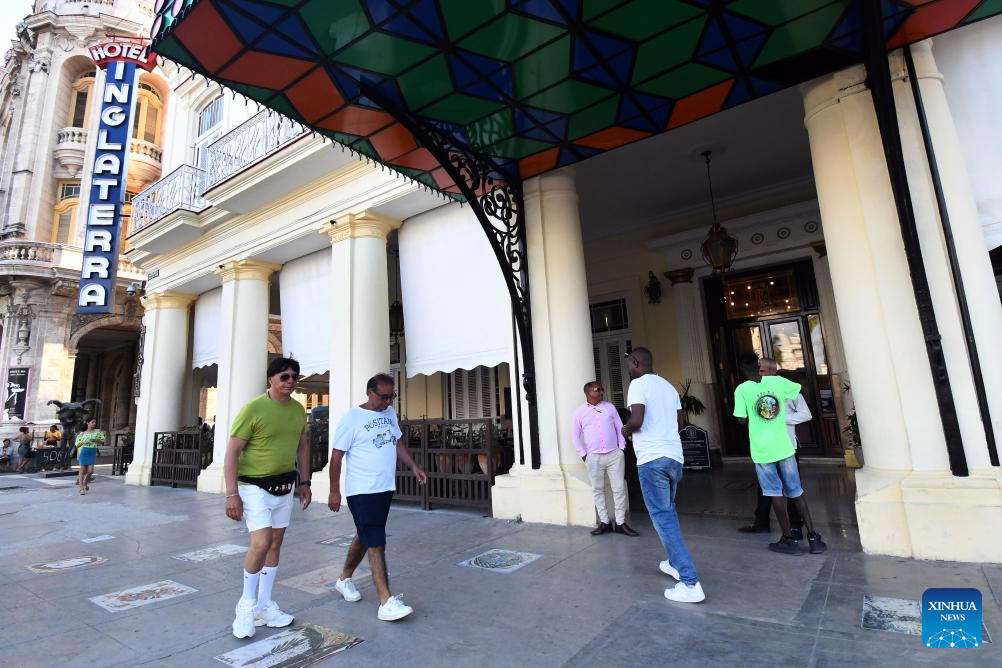 Imagen del 27 de abril de 2026 de personas caminando frente al Hotel Inglaterra, en La Habana, capital de Cuba. Cuba registró una caída del 48 por ciento en la llegada de turistas internacionales en el primer trimestre del año, de acuerdo con un reporte divulgado el martes por la Oficina Nacional de Estadísticas e Información. (Xinhua/Joaquín Hernández)