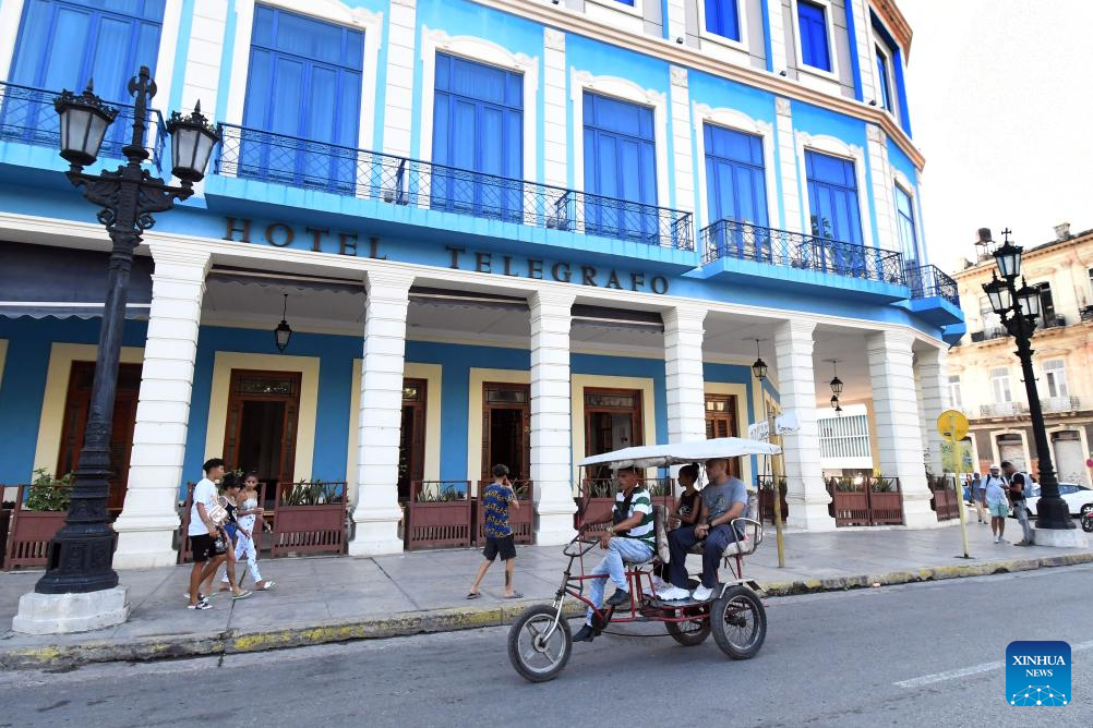Imagen del 27 de abril de 2026 de un bicitaxi circulando frente al Hotel Telégrafo, en La Habana, capital de Cuba. Cuba registró una caída del 48 por ciento en la llegada de turistas internacionales en el primer trimestre del año, de acuerdo con un reporte divulgado el martes por la Oficina Nacional de Estadísticas e Información. (Xinhua/Joaquín Hernández)