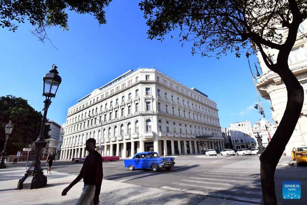 Imagen del 27 de abril de 2026 de un automóvil antiguo circulando frente al Hotel Manzana, en La Habana, capital de Cuba. Cuba registró una caída del 48 por ciento en la llegada de turistas internacionales en el primer trimestre del año, de acuerdo con un reporte divulgado el martes por la Oficina Nacional de Estadísticas e Información. (Xinhua/Joaquín Hernández)